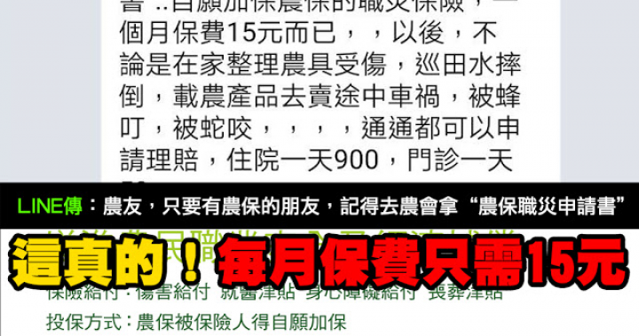 你LINE收到「農友,只要有農保的朋友」、「記得去農會拿農保職災申請書」,關於農民職業災害保險的訊息,事實上這是真的消息!農民職業災害保險於2018年11月1日起試辦,對於實際從事農業工作且為農保被保險人的農民,都可以親自到戶籍地的農會提出申請,每月保費只需 15 元,職災保險多了傷害給付和就醫津貼,而且是是現金給付,這也是原本農保沒有的項目。你LINE收到「農友,只要有農保的朋友」、「記得去農會拿農保職災申請書」,關於農民職業災害保險的訊息,事實上這是真的消息!農民職業災害保險於2018年11月1日起試辦,對於實際從事農業工作且為農保被保險人的農民,都可以親自到戶籍地的農會提出申請,每月保費只需 15 元,職災保險多了傷害給付和就醫津貼,而且是是現金給付,這也是原本農保沒有的項目。你LINE收到「農友,只要有農保的朋友」、「記得去農會拿農保職災申請書」,關於農民職業災害保險的訊息,事實上這是真的消息!農民職業災害保險於2018年11月1日起試辦,對於實際從事農業工作且為農保被保險人的農民,都可以親自到戶籍地的農會提出申請,每月保費只需 15 元,職災保險多了傷害給付和就醫津貼,而且是是現金給付,這也是原本農保沒有的項目。